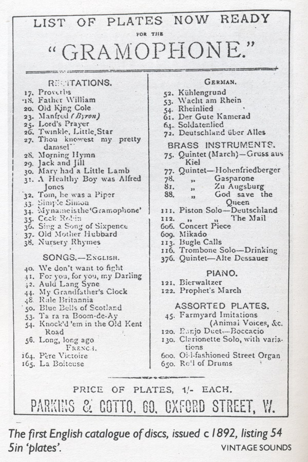 The first English catalogue of discs, issued c; 1892, listing 54 "plates"